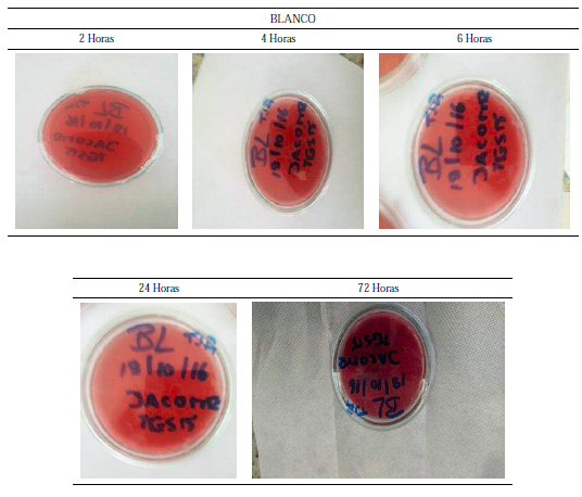 En una caja Petri con medio Mac Conkey Agar, se cultivó una sola muestra de agua fisiológica sin adicionarle jugo de naranja, esta caja Petri sirvió como el control negativo “Blanco”. Como se puede observar en la Tabla 3, el blanco desde las 2 horas hasta las 72 horas no presentó ningún tipo de cambio en cuanto al color del medio, el cual indicaría la fer- mentación de la lactosa, ni tampoco ningún tipo de UFC visible, por ende se lo tomó como un control negativo preciso.