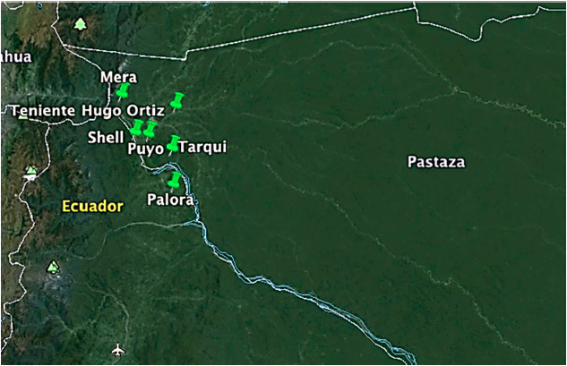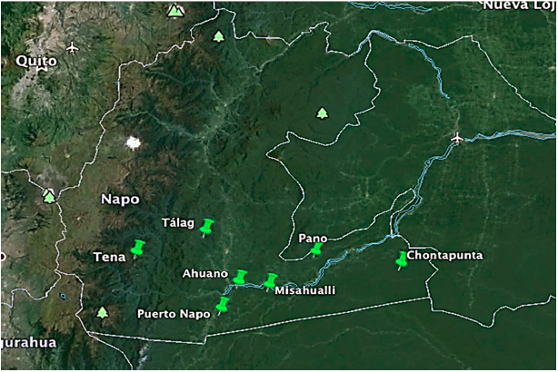 Esta investigación se desarrolló en las parroquias de Ahuano, Chontapunta, Pano, Misahuallí, Puerto Napo y Talag (cantón de Tena, provincia de Napo) (Figura 1); Mera, las provincias de Teniente Hugo Ortiz, Shell, Puyo, Tarqui (cantón de Puyo, provincia de Pastaza) y Palora (provincia de Morona Santiago) (Figura 2). Todos los lugares estudiados están entre 400 y 900 metros sobre el nivel del mar.