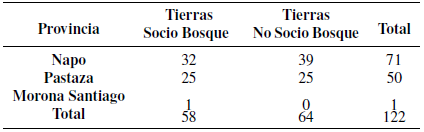 La Tabla 1 muestra el número de fincas que fueron evaluadas y su participación positiva o negativa en la iniciativa Socio Bosque en estas tres provincias.