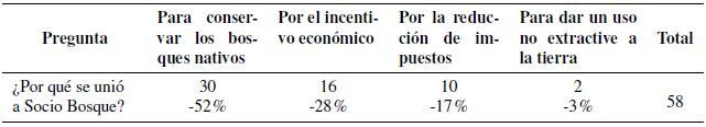 En cuanto a las razones que motivaron a los propietarios a inscribirse en el programa Socio Bosque (considerando 58 propietarios que ya estaban en el programa, de un total de 122 encuestados), se registraron cuatro tipos de respuestas (Tabla 2).