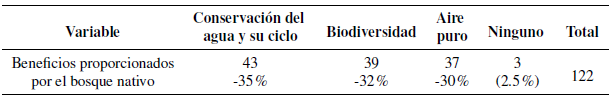 Los beneficios proporcionados para la conservación del bosque nativo incluyen varias situaciones ambientales y autoconscientes (Tabla 3).
