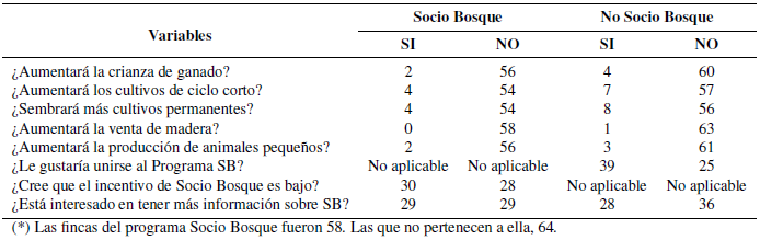 La negativa firme de aumentar la producción de animales más pequeños, tanto en fincas SB como NSB, puede explicarse por el hecho de que la producción de pollos, cobayas y conejos no tiene un alto rendimiento productivo, principalmente porque en estas zonas no existe conocimientos adecuados sobre el cuidado de estos animales (MAGAP, 2010). En cuanto a los propietarios que no están inscritos en el programa de SB, 39 de ellos quieren unirse al programa, y 25 no quieren, esto ocurre posiblemente porque no cumplen con el número de hectáreas necesarias, o no tienen su título de propiedad, o no están de acuerdo con las propuestas del programa Socio Bosque (MAE, 2014).
