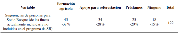 La sugerencia más importante para el programa de SB (37% de las opiniones) es que este programa debe llevar a cabo capacitaciones, que pueden darse a miembros de SB o no miembros. Estos talleres de capacitación pueden incluir aspectos ambientales, conservación y producción de cultivos de manera amistosa con la naturaleza. Alrededor del 20% solicita ayuda con préstamos para iniciar un negocio o comprar alguna propiedad mueble o inmueble. Otra solicitud de las personas pertenecientes y no pertenecientes a SB es ayudar con las actividades de reforestación. Exigen, por ejemplo, el inicio de programas permanentes relacionados con la plantación y el cuidado de árboles nativos en sus fincas. 15 % no pide nada o no tiene sugerencias ni nuevas expectativas para el programa Socio Bosque.