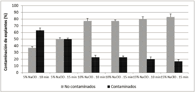 El menor porcentaje de contaminación en los explantes (17%) se obtuvo con el tratamiento t6 (15% de NaClO durante 15 minutos); al contrario del tratamiento t1 (5% de NaClO durante 10 minutos) que generó el 63% de contaminación fue la respuesta más alta. Valores iguales o superiores al 10 % de NaClO por un periodo de 10 minutos se obtienen respuestas constantes en cuanto a la presencia de explantes no contaminados (Gráfico 1).