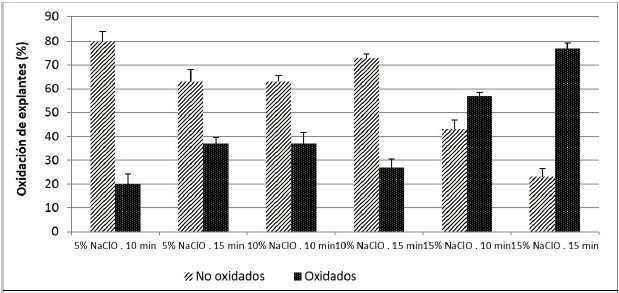 Se analizó la variable oxidación en cada uno de los tratamientos donde se evidencia que el tratamiento t1 (5 % NaClO x 5 minutos) alcanza el mayor porcentaje de explantes libres de oxidación (80%), seguido del tratamiento t4 (10 % NaClO x 15 minutos) (Gráfico 2). El cloro actúa como un bactericida potente debido a que forma ácido hipocloroso al mezclarse con el agua y el oxígeno liberado en esta reacción es un agente oxidante muy fuerte, al mismo tiempo que los microorganismos son destruidos ya que puede modificar grupos funcionales, inactivando proteínas enzimáticas. El cloro puede penetrar por las heridas y a concentraciones altas puede producir un efecto tóxico, inclusive puede causar la muerte del tejido vegetal por necrosis.