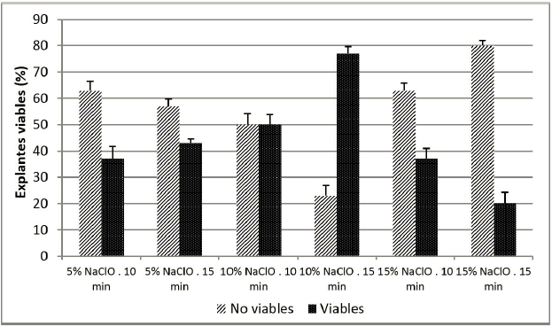 Así, se determinó que el tratamiento de 10% de hipoclorito de sodio por 15 minutos como el mejor tratamiento en desinfección, puesto que permite obtener un moderado porcentaje de contaminación (23%), oxidación (27%) y el mayor porcentaje de explantes viables (77%); resultados que se acercan efectivamente a lo divulgado por Engelman (2011), quien obtuvo un rango del 70 al 100 % de explantes viables con similares protocolos de desinfección; de tal manera que, en la práctica y como parte del rescate de germoplasma de manzana de la var. Emilia, el mejor tratamiento no es aquel que menos explantes contaminados presente, sino aquel que obtiene mayor cantidad de explantes viables.