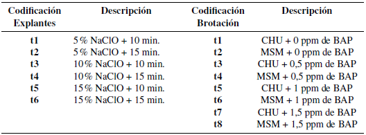 Se realizaron bioensayos para la evaluación de la contaminación en los explantes, utilizando 3 g L-1 de detergente comercial (componentes: tensioactivos, potenciadores, enzimas, blanqueadores, perfumes, relleno y abrillantadores ópticos) más la adición de 6 mL 100 mL-1 de Tween 20® y al final del proceso de lavado se aplicó etanol al 70% durante 30 segundos. Se probaron distintas concentraciones de Hipoclorito de Sodio en tiempos incrementales. En cuanto a las fases de brotación se evaluaron dos tipos medios de cultivo con distintas concentraciones de la hormona BAP (Cuadro 1).