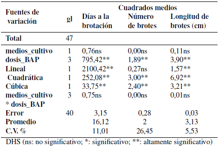 En el ADEVA (Cuadro 2) se encontró diferencias altamente significativas para concentraciones de BAP y para los polinomios ortogonales cuadráticos y cúbicos. El promedio general fue 2 brotes por explante y el coeficiente de variación fue 26,45%. De los polinomios ortogonales se destaca la tendencia cuadrática, en donde el efecto de los compuestos hormonales se ve reducido por el exceso en su concentración.