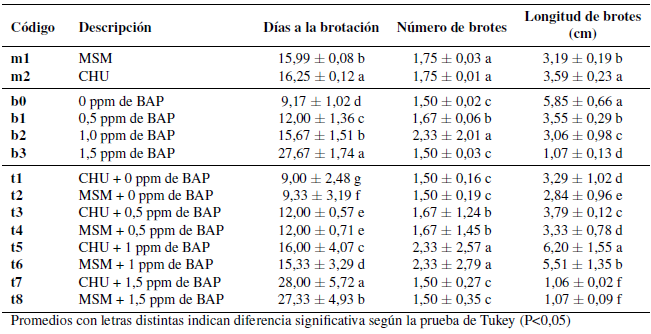 Para esta variable se presentó tres rangos de significación estadística (Cuadro 3). Se obtuvieron las mejores respuestas en los tratamientos con aplicación de 1 ppm de BAP, con similar promedio para cada uno (2,33 brotes explante-1); resultados que son aceptables si comparamos el índice de multiplicación por yemas axilares para otros cultivares de manzano que está en la relación 1:3 como es el caso del patrón clonal MM 106 (Forsline et al., 2003).