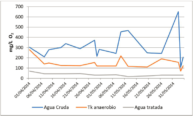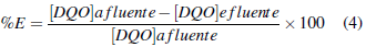 Se determinó la eficiencia del tratamiento anaerobio, aerobio y del sistema total utilizando la Ecuación (4), tomando los valores medios de la DQO del agua que ingresa (afluente) y la DQO del agua que sale después de cada etapa (efluente), obteniendo eficiencias de 53, 75 y 88% respectivamente.