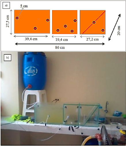 En Figura 3 (a) se muestra el dimensionamiento del equipo, el cual fue construido en vidrio (Figura 3 b) con un volumen útil de 27.9 L, de los cuales 15.8 L corresponden a la zona anaeróbica, 7.7 L al reactor aeróbico y 4.4 L al sedimentador. Dichas unidades se comunican a través de orificios de 5 mm de diámetro, ubicados en la parte superior de los tabiques. En las partes medias existen salidas con una manguera que permiten la extracción de muestras para su análisis. El suministro del aire y la mezcla completa en el tanque aerobio se realizó por medio de difusores porosos utilizando 2 aireadores de 60 Hz, introducidos por los orificios de 5 mm que se encuentran en la parte inferior del tanque. El control de lodos en tanque de aireación se realizó mediante la extracción de un volumen específico de lodos del sedimentador de forma manual. El agua cruda se recolecta en un tanque de plástico con capacidad de 30 L aproximadamente que alimenta el sistema por gravedad controlando su caudal por medio de unas llaves. El sistema se operó en el Laboratorio de Operaciones Unitarias de la Facultad de Ingeniería de la Universidad Nacional de Chimborazo.