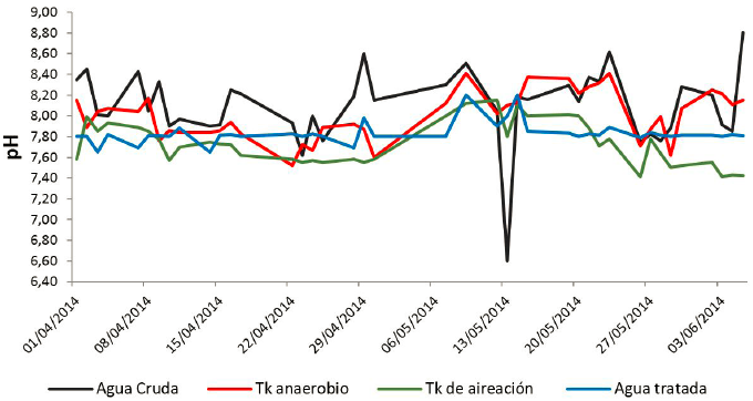 El pH es un factor muy importante en los procesos de transformación química y biológica por lo tanto es fundamental seguir su comportamiento con respecto al tiempo (Romero, 2008). En la Figura 4 se presenta el seguimiento del pH observando que en el agua cruda este parámetro es muy variable mientras que los valores en el resto de etapas se mantienen muy constantes, por lo que se puede concluir que en cada etapa el medio se va adaptando, manteniendo un sistema amortiguador de pH para el buen desarrollo de los microorganismos, permitiendo de este modo que el medio no se vea afectado por variaciones bruscas del pH del agua de alimentación. Similar comportamiento reportan los estudios realizados por Santos y Oliveira (2011) en el tratamiento de aguas residuales porcinas realizadas en un reactor discontinuo secuencial anaeróbico-aeróbico, donde se determina también que el pH durante el tratamiento biológico se estabiliza.