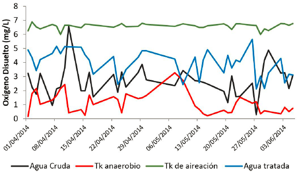 En la Figura 5 se observa que el oxígeno disuelto es muy variable en el agua cruda, disminuye en el tanque séptico pero sin llegar a condiciones anaeróbicas (sin oxígeno o tan baja como sea posible), la concentración de OD en esta zona se mantuvo con un promedio de 1,13±0,75 mg/L debido a que ingresa oxígeno al tomar muestras diarias para el análisis, lo que implicó reducciones bajas de DQO debido al bajo crecimiento de los microorganismos anaerobios. En el tanque de aireación el oxígeno disuelto se mantienen con valores promedios de 6 mg/L, logrando un desarrollo adecuado de los microorganismos aerobios, cabe indicar que el valor mínimo requerido es de 2 mg/l (Metcalf y Eddy, 2003).