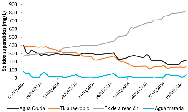 En la Figura 6 se grafican los resultados de SS en las diferentes etapas de tratamiento, los mismos que disminuyen en el tanque séptico y en el efluente, con rendimientos de eliminación que oscilaron entre 40 y 90% respectivamente, Kaudel y Dichtl (2000) y Cárdenas et al. (2012) reportan similares reducciones en pruebas a escala de laboratorios en reactores biológicos secuenciales (anaerobio-aerobio). En el tanque de aireación se observa un incremento progresivo de sólidos suspendidos, según Metcalf y Eddy (2003) los sólidos suspendidos en el licor de mezcla deben estar en un rango entre 1500 y 3000 mg/L para que el sistema funcione eficientemente.