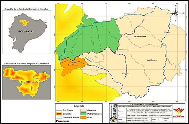 La investigación se desarrolló con 25 organizaciones de riego de las comunidades andinas del margen izquierdo de la cuenca del río Pisque ubicada al norte de la provincia de Pichincha a 75 km de la capital del Ecuador (Mapa 1), este territorio se caracteriza por tener un promedio de temperatura de 13,6ºC., una precipitación anual de 519,23 mm, su topografía es ondulada con suelos de origen volcánico, el territorio pertenece al pueblo Kayambi. Las principales actividades productivas con riego son: producción de flores, ganadería de leche y productos para autoconsumo (hortalizas, cereales y tubérculos) (Moreno, 2015).