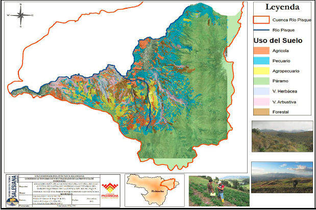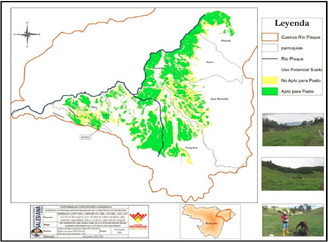 Con los criterios de disponibilidad riego, mapas de pendientes e índices de calidad y salud de los suelos se elabora el mapa de uso potencial del suelo para la producción de pastos en el margen izquierdo de la cuenca del río Pisque, dando como resultado que una superficie 14 797.75 ha, sería lo más recomendable para este territorio (Mapa 3). Para una producción agrícola sustentable el factor determinante es dotar de agua de riego de forma oportuna y eficiente (Communal et al., 2016).