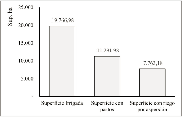 La superficie irrigada en el margen izquierdo de la cuenca del río Pisque es de 19 766,98 hectáreas, estando la mayor parte cubierta por el sistema de riego del canal Guanguilqui, que tiene 63 óvalos de distribución y un perímetro irrigado que abarca 4 parroquias, en 43 comunidades y 4 haciendas concienciando con lo expuesto por Acero (2014). Por otro lado, 11 291,36 ha de las tierras agrícolas están dedicadas al cultivo de pasto de estas 7 763,18 ha se encuentran con riego por aspersión (Gráfico 2).