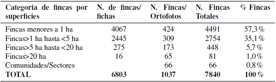 El Padrón de usuarios constituye una herramienta básica para la gestión del agua de riego, siendo importante que los dirigentes de las comunidades, juntas y/o directorios de agua de riego lo mantengan siempre actualizado, la información principal se basa en la superficie regada, sistemas de producción, métodos de riego y número de usuarios del sistema. A través de la ficha base de riego se ubicaron un total de 6 803 fincas y con los SIG se ubicaron 1 037 fincas (Tabla 1), distribuidas en 4 categorías por tamaño de finca (971) y 66 corresponden a la superficie ubicada como comunidad o sector. La superficie ubicada con la ficha y los SIG suma un total aproximado de 7.840 fincas ubicadas dentro del margen izquierdo de la cuenca del río Pisque, siendo el 57.3% de fincas menores de 1 hectárea, es decir, existe un proceso de minifundización del territorio en donde las posibilidades de capitalización de las fincas sean menores y se produzca la migración de los miembros de la familia de las comunidades buscando mejores oportunidades de trabajo principalmente. El minifundio también influye en el diseño, instalación y manejo del riego, este factor puede ocasionar ineficiencia especialmente a nivel de distribución.