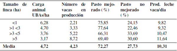 La sustentabilidad de los sistemas productivos va de la mano con la intensificación del uso del suelo y tamaño de la tierra, es decir, un número elevado de animales alimentados con el forraje obtenido en una unidad de superficie (ha). Las pasturas andinas son complejas, dependiendo de la altitud y del clima de la zona así como de las especies forrajeras que las conforman la disponibilidad es variable, nótese en la tabla 1 como las fincas < 1 ha que tienen el mayor porcentaje de pasto mejorado, muestran una carga animal superior que las fincas > 5 ha con menor porcentaje de pastos mejorados, es decir, el tipo de pastura determina la carga animal de la finca, Requelme, (2012), reporta una carga animal en la zona de 0,54 UBA/ha en fincas menores de 5 ha tratándose de sistemas extensivos de producción. En términos de producción la relación es inversa, las fincas >5 ha con mayor número de vacas en producción, presentan una mayor producción de leche l/vaca/día mientras que las fincas <1 ha con menos animales en producción, tienen un rendimiento menor (9,8 l/vaca/día) pero que en términos de eficiencia en alimentación es superior y en reducción de emisiones de metano es menor contribuyendo así a la sustentabilidad en la producción de estos sistemas de producción de leche.