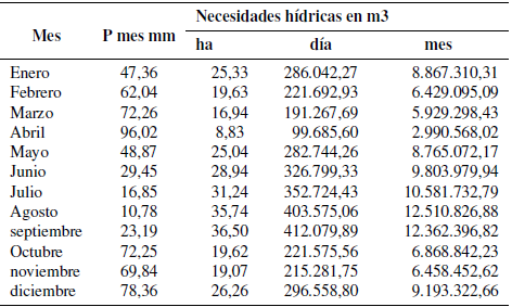 Los meses con presencia de lluvia necesaria para cubrir las demandas del cultivo fueron abril y diciembre con 96,02 y 78,36 mm respectivamente y el mes de menor presencia de lluvia fue agosto, siendo este mes el de mayor demanda hídrica (Tabla 3.), estos meses coinciden con los meses de temperaturas altas y fuertes vientos lo que incrementa la evapotranspiración y las necesidades hídricas de los cultivos son mayores, datos que coinciden con los reportados por Sandoval (2014).