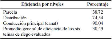 La eficiencia de los sistemas de riego difiere según los niveles, la mayor ineficiencia se presenta a nivel de aplicación del agua en la parcela, principalmente por desconocimiento del regante en el manejo de los aspersores y láminas de agua; a nivel de distribución la eficiencia es alta porque la mayoría de sistemas de riego cuentan con reservorios y redes de conducción secundaria y terciarias entubadas; y, a nivel de canal principal tienen una alta eficiencia debido a que los sistemas de conducción de la fuente hasta los reservorios son entubados o canales revestidos.