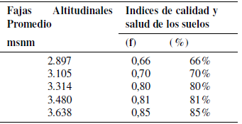 La valoración de los índices de calidad y salud de los suelos se realiza en el área comprendida entre los 2 800-3 600 msnm, en este rango altitudinal se detectó la mayor superficie de suelo destinada a producción de pastizales. En la Tabla 5, se observa que los suelos dedicados a la producción de pastos sobre los 3 300 a 3 600 msnm, presentan los más altos índices de calidad de los suelos. Esto indica que la implementación de prácticas agrícolas desarrolladas en suelos sobre los 3 300 msnm, no han provocado de manera significativa efectos negativos sobre las propiedades físicas y químicas. Por otro lado, al reducir la altitud de la zona en estudio, los índices de calidad y salud de suelos disminuyen, sin embargo, los mencionados índices se encuentran sobre los valores considerados como adecuados para los suelos agrícolas. Si bien existe diferencia en relación con el índice de calidad y salud de los suelos entre fajas altitudinales se puede atribuir esta diferencia al manejo agrícola del suelo (Communal et al., 2016).