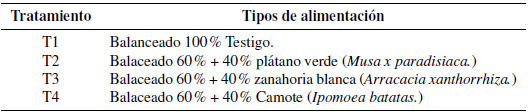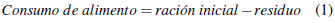 La cantidad de alimento suministrado a los animales se determinó de acuerdo a la tabla de consumo por edad y peso que recomiendan las Tablas Brasileñas para Aves y Cerdos (Santiago Rostagno et al., 2005), para el T1 se alimentó únicamente con balanceado; en los tratamientos T2, T3 y T4 se consideró una inclusión de 60% de balanceado y un 40 % de residuos de cosecha. La cantidad de alimento balanceado y residuo de cosecha se calculó todos los días dividiéndose en dos raciones al día, el primero fue a las 8 am y la segunda 4 pm. Para determinar el consumo de alimento antes de suministrar la siguiente ración se pesaba el residuo alimento. El consumo se determinó mediante la siguiente ecuación.
