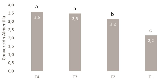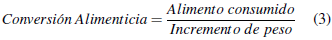 La conversión alimenticia es el resultado del cálculo del alimento consumido dividido para el incremento de peso de los cerdos en cada uno de los tratamientos.