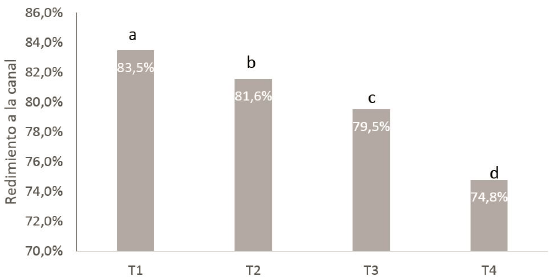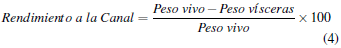 La variable rendimiento a la canal, se la realizó una vez que los animales alcanzaron el peso comercial (aproximadamente 100 kg) con 5 meses de edad. Esta variable es la relación del peso vivo del animal y el peso después del faenamiento sin vísceras.