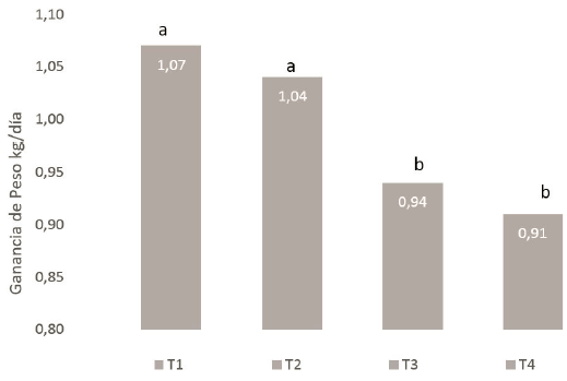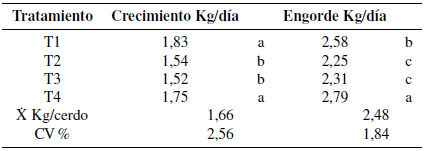 Los cerdos alimentados con el T1 y T2 obtuvieron las mejores GP 1,07 y 1,04 kg/día, mientras que los T3 y T4 obtuvieron GP menores en el siguiente orden 0,94 y 0,91 kg/día. Para De Blas (2006) se pueden obtener ganancias de peso en cerdos de cebo entre 0,9 y 1,0 kg/día, con genéticas mejoradas.