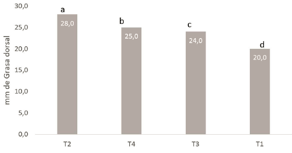 Los cerdos del T2 alcanzaron una mayor GD de 28 mm, seguido del T4 con GD de 25 mm, luego el T3 con un GD 24 mm, y menor fue el T1 con 20 mm, Medel & Mariscal (2004) determinaron que los cerdos con pesos de 103 kg tienen 14 mm de grasa dorsal y cerdos con 125 kg tienen 18 mm de grasa dorsal. (Angeles Marin et al., 1997), determinaron que cerdos alimentados con ensilaje de plátano verde o maduro tuvieron una GD de 27 mm. Domínguez (2008) estableció que cerdos alimentados en etapa de cebado con ensilaje de naranjas, acumularon hasta 36 mm de grasa dorsal.