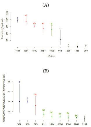 Los resultados estadísticos demuestran que no existem diferencias significativas en la concentración de Fe y la acidez intercambiable en las diferentes profundidades (p=0.85). Por otro lado, se pueden observar fuertes diferencias aplicando ANOVA en las altitudes (p =0,00005). En la Figura 2 la prueb aDuncan resume a los grupos para los parámetros evaluados con respecto a las diferentes altitudes. Esta información presenta las medias y los intervalos de confianza para cualquier altitud en los ensayos. Los valores de concentración de Fe disminuyen a medida que reduce la altitud (Figura 1. A).
