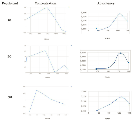 La Figura 1 corresponde a la primera derivadadel contenido de Fe (concentración y absorbencia) en las altitudes estudiadas. Se observa un patrón bastante linear en las profundidades (especialmente a 10 centímetros). En las tres gráficas se evidencia que los valores de los derivados alrededor de 1 000 y 1 200 msnm son negativos o similares. Se observó la concentración más alta de Fe, 222 mg/kg en 1 564 msnm a una profundidad de 20cm; mientras que la concentración más baja de Fe,2,27 mg/kg se midió en 386 msnm a una profundidad de 20 cm. Se observa una clara tendencia decreciente en los valores de concentración a medida que disminuye la altitud.