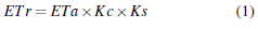 En donde: ETr es la evapotranspiración real (mm día−1), ETa es la evapotranspiración de referencia (mm día−1), Kc es el coeficiente de cultivo (adimensional) y Ks el factor de estrés hídrico (adimensional).