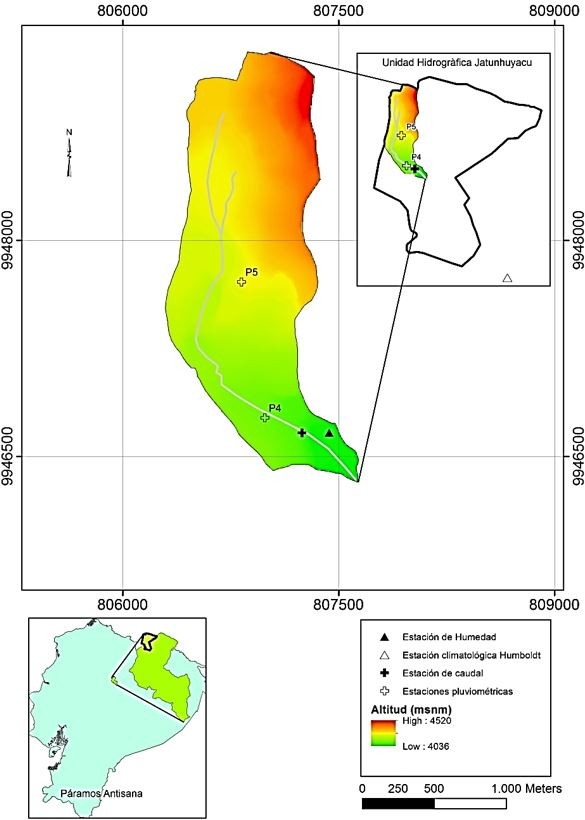 La cuenca en estudio se encuentra ubicada en el páramo del Antisana, perteneciente a la unidad hidrográfica del río Jatunhuaycu, fuente abastecedora de agua potable para la cuidad de Quito en Ecuador; geográficamente se localiza en los 0° 28’ 15” latitud Sur y 78° 14’ 34” longitud Oeste. Jatunsacha que drena sus aguas hacia la cuenca del río Amazonas cubre un área de 2,1 km2, con una pendiente promedio del 20% distribuida en una gradiente altitudinal que varía entre los 4036 msnm y 4520 msnm (Figura 1), con intervención relativamente baja por ganado vacuno y sin aporte por flujo del glacial Antisana (Alvarado,2009; Torres, 2016).