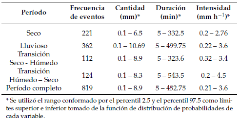 Durante el período de estudio se registraron 819 eventos con cantidades de lluvia que varían de 0,1 mm a 8,9 mm, duraciones de 5 min a 452,75 min e intensidades entre 0,21 mm h−1 a 3,6 mm h−1. El período lluvioso presentó el mayor número de eventos con 362 y el rango más amplio en la cantidad de lluvia; la transición de seco a húmedo registró el menor número de eventos (112) y rangos con baja longitud en las variables duración e intensidad. En el período seco se registraron 221 eventos con el rango más corto en cantidad de lluvia; por último la transición de húmedo a seco definido por los 124 eventos presenta el rango más alto en duración (Tabla 1).