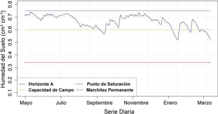 La humedad del suelo en el horizonte A (Figura 3), a escala diaria para el periodo de estudio presenta dos temporadas de máximo contenido de humedad, el 12 de mayo del 2014 y el 11 de noviembre del 2014 con 0,74 cm3 cm−3 y 0,73 cm3 cm−3, respectivamente; originando que la humedad esté próximo a punto de saturación (0,75 cm3 cm−3). Su pico más bajo se registró el 16 de enero del 2015 con un valor de 0,51 cm3 cm−3, lo que generó que la curva de humedad del suelo disminuya por debajo de la capacidad de campo (0,6 cm3 cm−3); esta tendencia se presentó en cuatro periodos adicionales que corres- ponden al 13 de septiembre del 2014, 7 de febrero del 2015, 23 de febrero del 2015 y 13 de marzo del 2015.