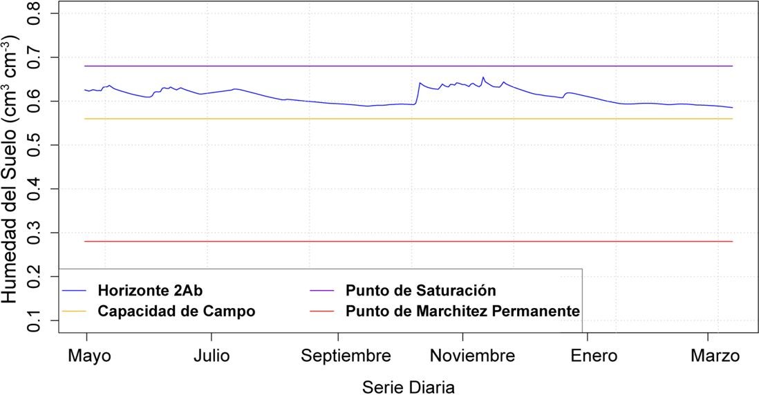 La dinámica del horizonte 2Ab es más estable, con valores entre capacidad de campo (0,56 cm3 cm−3) y punto de saturación (0,68 cm3 cm−3) (Figura 4), con un pico máximo que se originó el 11 de noviembre del 2014 de 0,65 cm3 cm−3. El punto más bajo de la curva de humedad del suelo diaria se pre- sentó el 13 de marzo del 2015 con un registro de 0,58 cm3 cm−3, dato superior al encontrado en el pico más bajo del horizonte superficial (0,51 cm3 cm−3). El alto contenido de agua en el horizonte 2Ab se debe principalmente a la baja densidad aparente con 0,70 Mg m−3, alta porosidad de 68,36% y alto contenido de materia orgánica con 5,8% (Nanzyo, Shoji y Dahlgren,1993; Buytaert, Deckers y Wyseure, 2007); que permite una capacidad de almacenamiento entre 365,4 mm y 326,43 mm, al considerar una profundidad del horizonte 2Ab de 55,8 cm.
