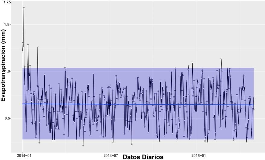 La ETr anual calculada para la cuenca Jatunsacha fue de 237,66 mm, con un promedio diario de 0,65 mm día−1 y con registros entre 0,28 mm día-1 a 1,04 mm día−1, que corresponden a los limites inferiores y superior de la distribución de probabilidades de los datos; su comportamiento fue estacionario para el período de análisis, mostrando valores extremos de 1,68 mm día−1 en los primeros días de enero del 2014 y mínimos de 0,07 mm día−1 en junio del 2014 (Figura 5).