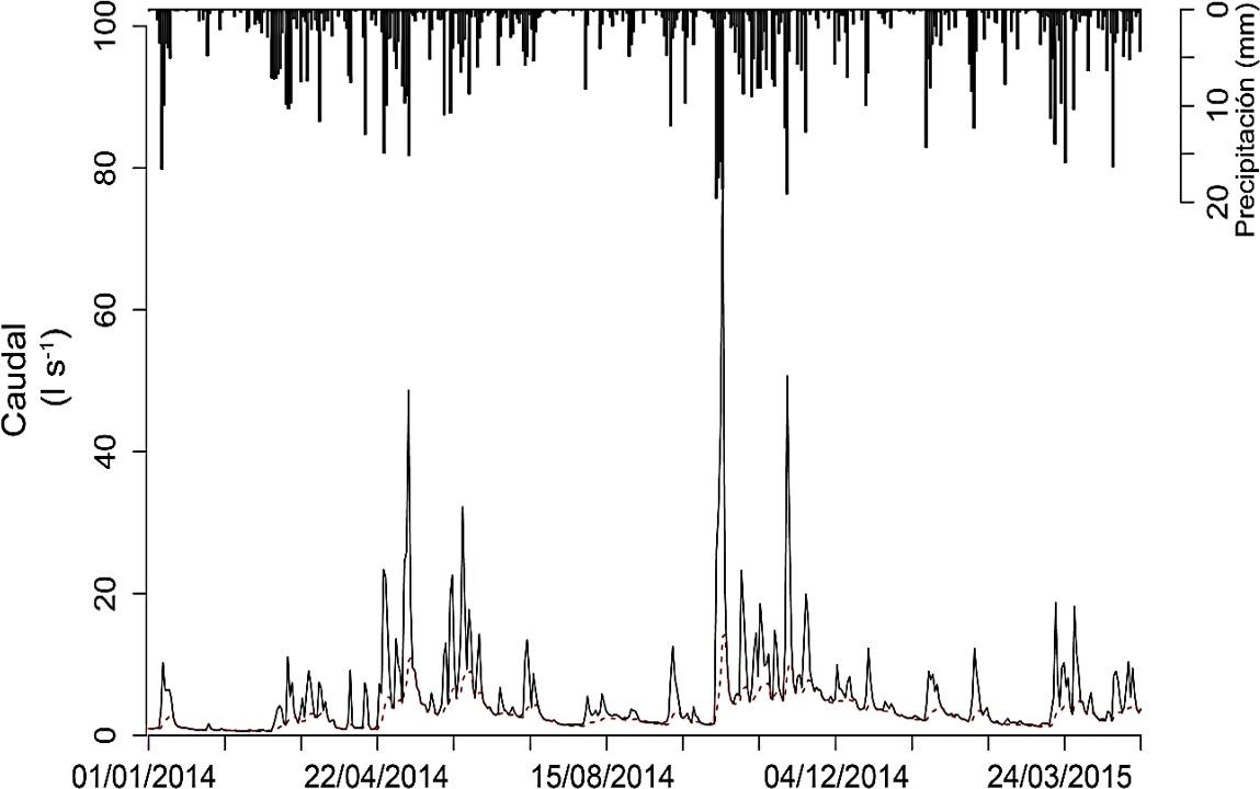Para la medición del caudal se construyó un vertedero de pared delgada de sección combinada triangular y rectangular y se instaló una sonda de nivel automática Instrumentación Northwest (INW) marca PT2X, que acumuló datos cada cinco minutos (Torres, 2016) del período 1 de enero del 2014 al 30 de abril del 2015. Con la información de las mediciones de altura del nivel de agua, que relaciona la presión de la columna de agua por encima del punto cero del vertedero y la presión atmosférica; y considerando las dimensiones de la infraestructura hidráulica se transformaron los datos a caudal aplicando la relación de Sotelo Avila (1974) para la sección triangular y la de Kindsvater y Carter (1957) para la sección rectangular.