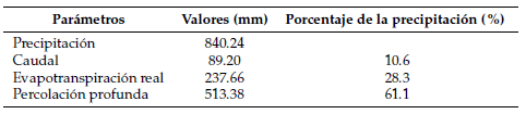 Con la instrumentación de precisión instalada y con información de calidad procesada en cada uno de los parámetros del balance hídrico anual analizados, se cuantificó la pérdida de agua por percolación profunda para recarga de acuíferos, en base a la ecuación general, proyectando un registr o de 513,38 mm que representa el 61,1% de la precipitación (Tabla 2), siendo el principal parámetro que genera flujo de salida del sistema, y aparentemente esto se genera por la geoestructuras porosa en la zona (Coltorti y Ollier, 2000).