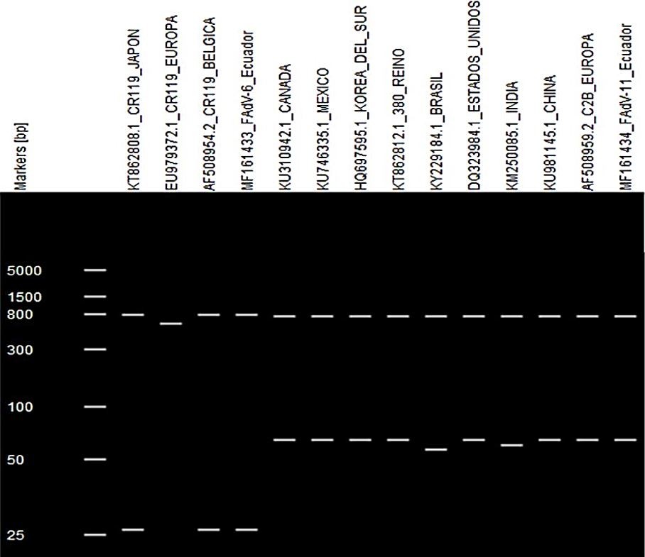 El producto final de la PCR para las 13 muestras fue sometido a electroforesis en gel de agarosa al 1,5%, con un marcador de peso molecular de 100 pb (100 bp DNA Ladder, Invitrogen TM), encontrando 4/13 resultados positivos (30,8%), al mostrar las bandas a la altura aproximada de 897 pb, las cuales fueron analizadas para la caracterización del respectivo serotipo (Mettifogo et al., 2014; Joubert et al., 2014; De la Torre et al., 2018). De acuerdo con Meulemans et al. (2001), el ADN amplificado mediante esta reacción puede incluir a los 12 serotipos de FAdV-I, sin poder determinar directamente el serotipo específico, a no ser que se utilicen enzimas de restricción para la obtención de bandas de ADN en gel de agarosa con tamaños específicos para cada serotipo (Figura 2) (Meulemans et al., 2001), o mediante el análisis de las secuencias de nucleótidos cuando son comparados con secuencias almacenadas en la base de datos del GeneBank. Mediante unanálisis virtual sobre el uso de enzimas de restricción,se pudo determinar que el uso de la enzima PstI, provocó un corte del ADN en el sitio de reconocimiento (CTGCAG) de las secuencias de 808 pbde la cepa CR119 de Japón, Bélgica y USP-EC-01,dando como resultado dos bandas de 786 pb y 26pb (Figura 2), a excepción de la cepa CR119 de Europa,que, por contar únicamente con 596 pb, no demostró regiones disponibles para la acción de cualquier enzima de restricción. Una enzima adicional EcoRI, realizó cortes del ADN en el sitio de reconocimiento (GAATTC) de las demás secuencias caracterizadas como serotipos 11 del FAdV-I, incluyendo la secuencia USP-EC-02, dando como resultado dos bandas de 746 bp y 63bp (Figura 2).