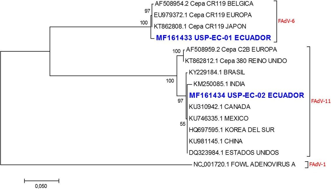 Los resultados del análisis filogenético se muestran en la Figura 2. Todas las secuencias analizadas fueron agrupadas en dos grupos mayores que corresponden a los serotipos 6 y 11 del FAdV-I. La secuencia USP-EC-01, fue agrupada junto la cepa CR119 perteneciente al serotipo 6 del FAdV-I, registradas como originarias de Bélgica, Europa y Japón, demostrando la presencia de esta cepa viral en al menos los 3 continentes (Europa, Asia y América). La secuencia USP-EC-02, fue agrupada junto con secuencias de Europa, Reino Unido, Brasil, India, Canadá, México, Korea del Sur, China y Estados Uni- dos, las cuales han sido caracterizadas con el serotipo 11 del FAdV-I.
