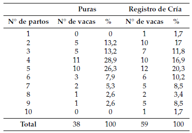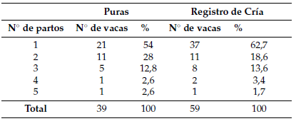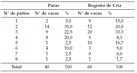 La Tabla 4 muestra que ambos grupos -vacas purasy vacas con registro de cría- poseen una similar distribución porcentual de animales con diferentes números de lactancias.