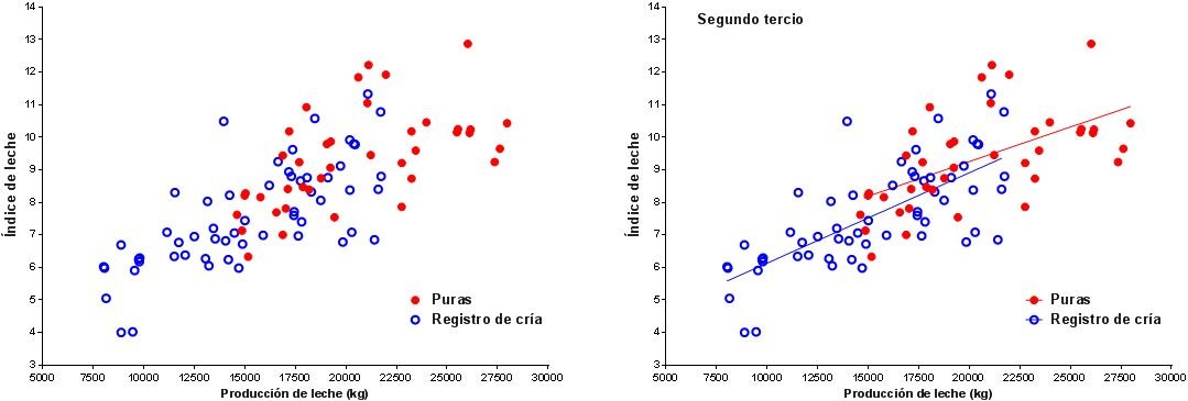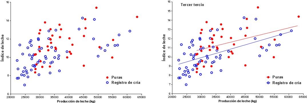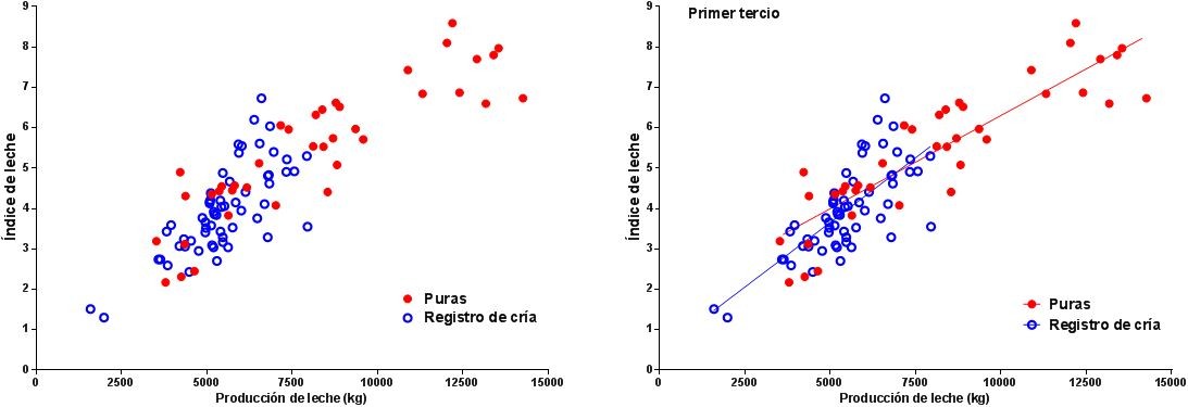 Los datos -índice de leche versus producción de leche- para cada categoría productiva, tanto de las vacas puras como de las vacas con registro de cría, se ajustaron por regresión lineal simple, previa constatación del comportamiento lineal mediante un test de rachas o ciclos (Sheskin, 2011). Los estimadores de los parámetros de las rectas de regresión se compararon mediante un análisis de la covariancia. Las comparaciones entre tercios de produc- ción para cada tipo de vaca (pura y con registro de cría) se limitaron a las respectivas pendientes, mientras que las correspondientes al tipo de vaca para cada nivel de producción (baja, media y alta) incluyeron también a las alturas (ordenada al origen) de las mismas.