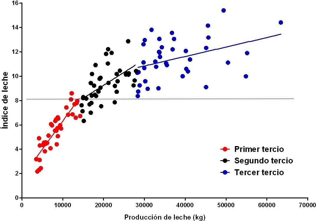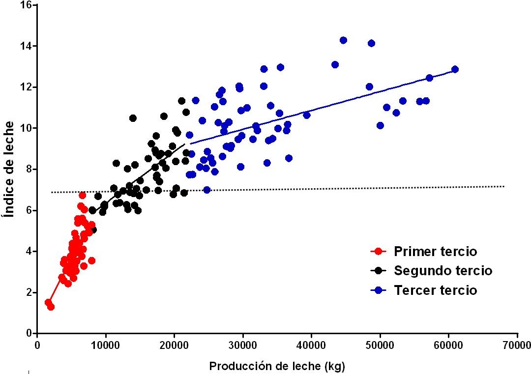 La Figura 2 resume la relación entre el índice de leche y la producción total de leche para las tres categorías productivas, en las vacas con registro de cría (VRC). Como era de esperar también en este caso se reitera que a mayor producción de leche acumulada corresponde un mayor valor del índice de leche. Nuevamente, si se consideran los datos en su totalidad, la asociación no es lineal, sino que tiende a estabilizarse a juzgar por los valores de los respectivos coeficientes de correlación: Primer tercio (vacas de baja producción): r = 0,739; P <0,0001; Segundo tercio (vacas de producción intermedia): r =0,691; P <0,0001 y Tercer tercio (vacas de alta producción): r = 0,568; P<0,0001.