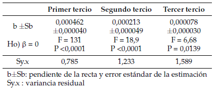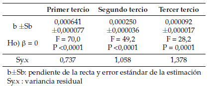 La Tabla 1 presenta los resultados derivados del ajuste lineal de cada uno de los tres tramos mencionados. Para ninguno de ellos se rechazó la hipótesis de linealidad (test de ciclos o rachas no significativo, P >0,05). Todas las pendientes fueron positivas y significativamente diferentes de cero (P <0,05). Se observó una disminución del valor de la pendiente (diferencia entre pendientes estadísticamente significativa: F = 17,13; P <0,0001) junto con un aumento de la variancia residual (Sy.x).