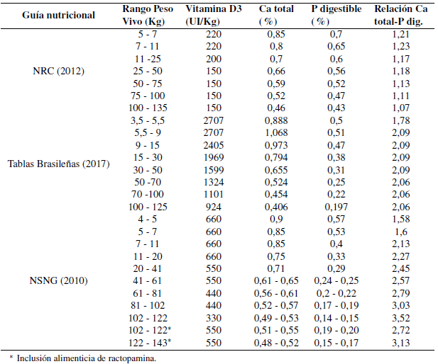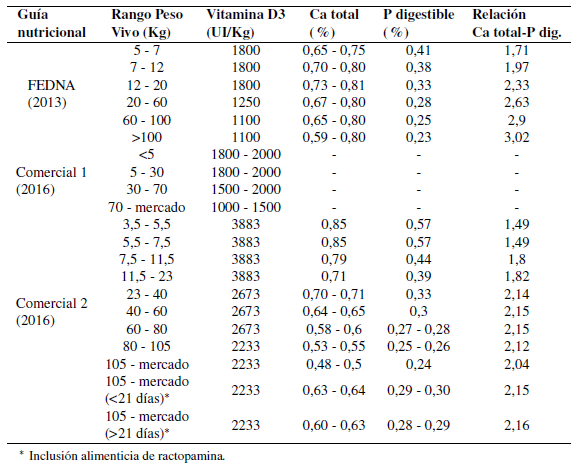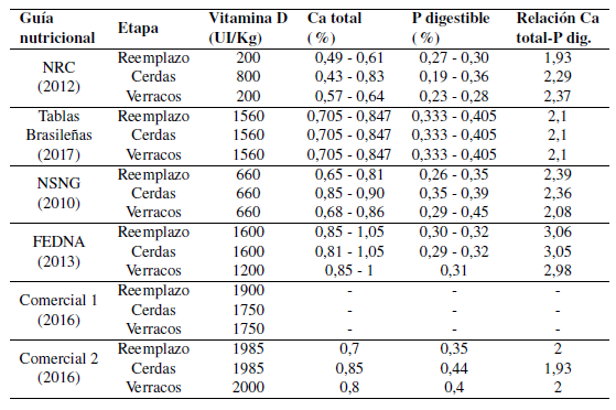 Varias son las fuentes de información (guías nutricionales) de las cuales se pueden obtener las recomendaciones nutricionales para cerdos en etapas productiva (engorde) y reproductiva. Amplia es la variación existente entre las sugerencias de vitamina D, calcio total y fósforo digestible entre las distintas referencias, el nutricionista y/o especialista en producción porcina debe estar en la capacidad de adaptar los niveles de nutrientes sugeridos a las condicio- nes de producción en las cuales trabaja, buscando de esta manera alcanzar los objetivos de la granja.