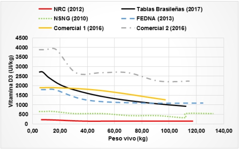 Los requerimientos de vitamina D se expresan en Unidades Internacionales (UI) por kilogramo de alimento, mientras que Ca total y P dig. se expresan en términos de composición porcentual (%) (Tablas 2 y 3). No se incluyó el valor de fósforo total pues este no se utilizó en varias de las guías utilizadas. En la Figura 1 se grafican líneas de tendencia de las necesidades de vitamina D3 (eje vertical) considerando el peso del cerdo (eje horizontal).