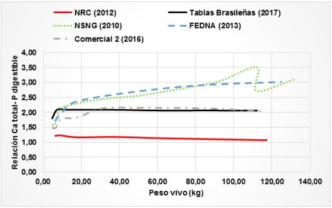 La relación Ca total-P dig. (Tablas 2 y 3) resulta de dividir el valor de la columna Ca total para el valor de la columna P dig. y se consideró como una variable referencial para poder comparar entre las diferentes fuentes de información; además se ha graficado la tendencia de la relación considerando los requerimientos a medida que el cerdo va creciendo (Figura 2). La primera de ellas NRC con una recta sostenida a lo largo del crecimiento del cerdo con valores superiores a 1 (1;07-1;21), sin importantes variaciones hasta llegar al peso de faena. Las Tablas brasileñas y Comercial 2 presentan también una recta sostenida pero sus valores están muy próximos a 2; 1;78 - 2;09 y 1;49 - 2;16 respectivamente. Por su parte U.S. Pork Centerof Excellence, (2010) y FEDNA, (2013) presentan una tendencia al aumento a medida que el cerdo crece, llegando a alcanzar una relación de 3 o más. Valores más altos de la relación Ca total - P digestible resultan de una gran amplitud entre los niveles de Ca sugerido y los requerimientos de P, específicamente altos requerimientos de Ca y más bajos de P. No fue posible presentar la tendencia de Comercial 1 pues esta guía únicamente hace recomendaciones de vitaminas.